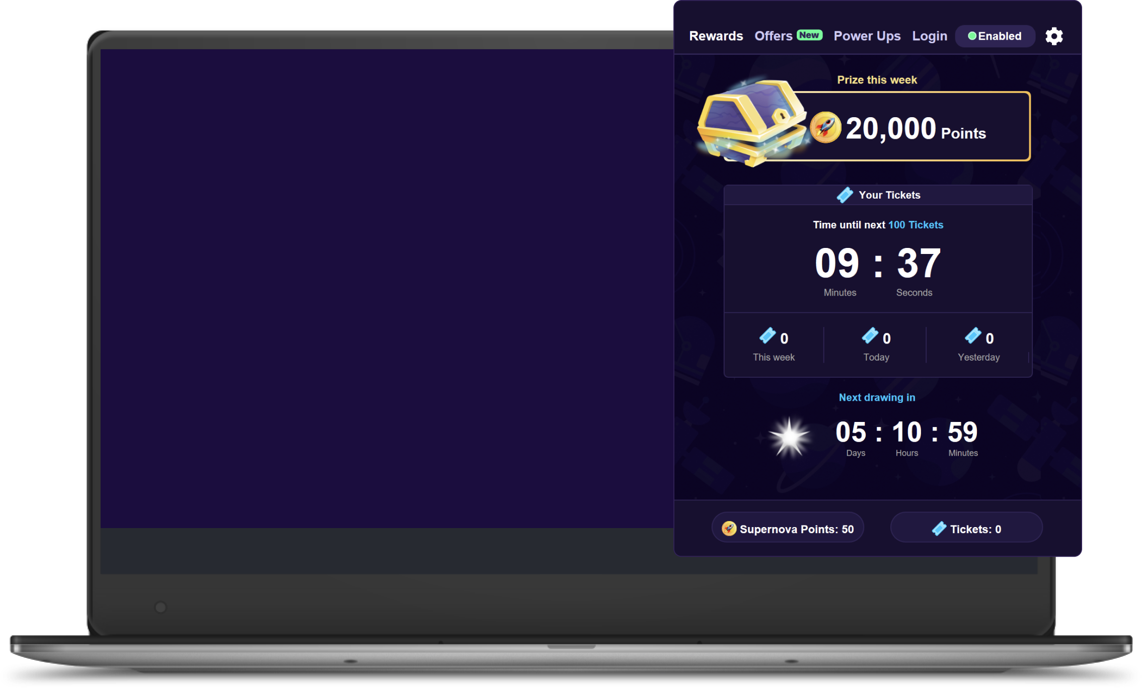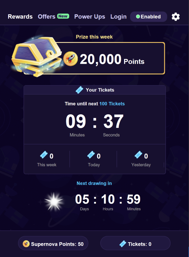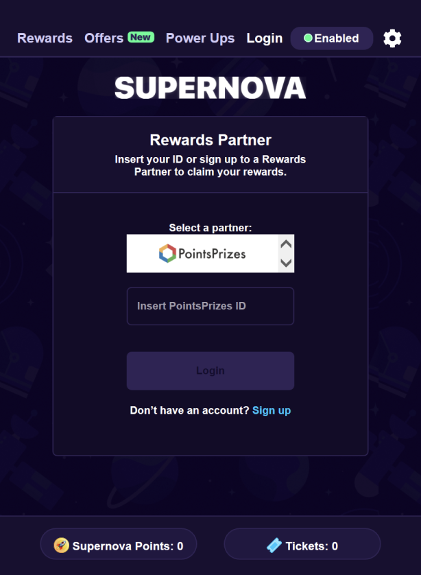 Supernova lets users win points to be redeemed with rewards partners. It also lets users get 100 FREE Sweepstakes tickets every 10 minutes toward a weekly points jackpot, without even doing any tasks! It currently only works on Windows PC. There is no mobile app at the moment. Once you have installed it, make sure to log in to a rewards partner account. It currently only works on 64-bit operating systems.
